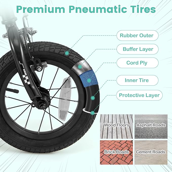 - Pneumatic Tires & Training Wheels: The wide pneumatic tires are built for durability and traction, offering a smooth ride on various surfaces including wood floors, asphalt roads, brick paths and cement sidewalks. The detachable training wheels offer stability for beginners and can be removed as your child's cycling skills improve.