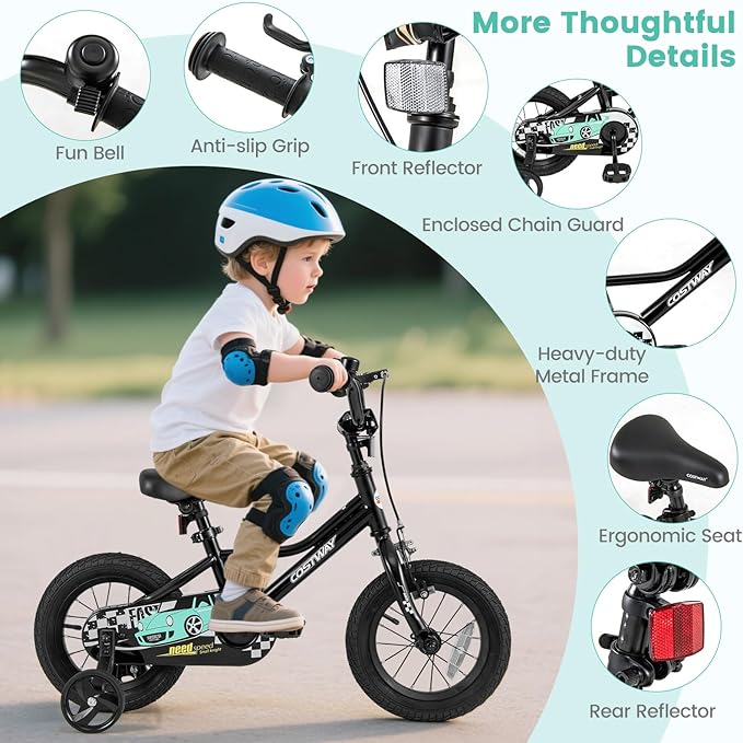- More Practical Designs: This 12 inch kids bicycle is designed with an ergonomic seat that provides comfort during longer rides. The front and rear reflectors offer visibility, plus a fun bell to add excitement to every ride. In addition, the pre-assembled design of the kids bicycle provides convenience for installation.