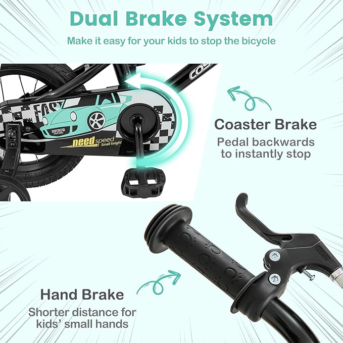 - Safe Riding Experience: The hand brake is designed with a shorter reach, perfect for small hands, while the rear coaster brake allows instantly stopping by simply pedaling backward. Besides, this toddler bicycle comes with a fully enclosed chain guard to prevent accidental contact with moving parts.