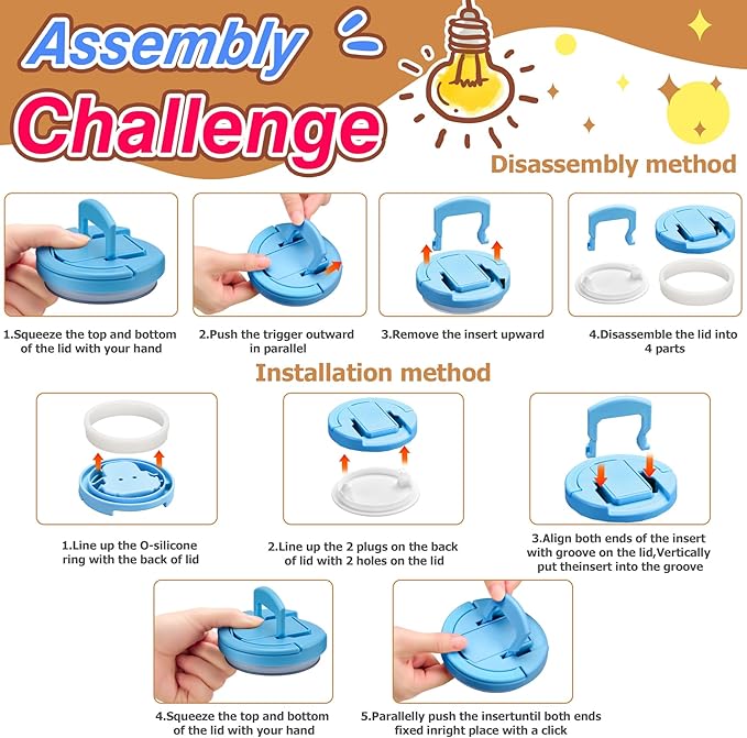 - Share your challenge: If you don't watch the video or installation manual, only a very small number of people can disassemble and install the lid by themselves,Welcome to challenge the disassembly and assembly of the lid.After successfully disassembling and assembling the lid, you will find it very interesting. If you do not know how to install the product after receiving it, please refer to the installation video and step-by-step pictures for instructions.
