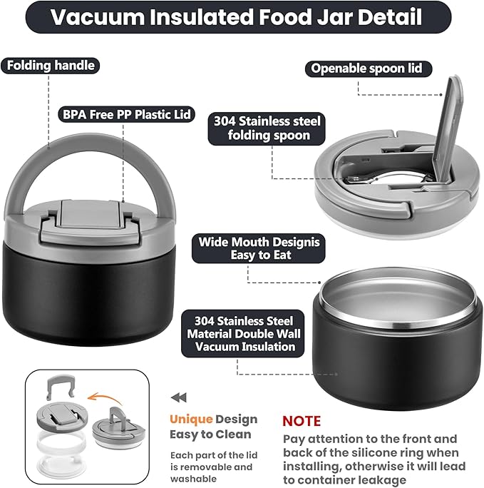 - Use Tips and Notes: In order to keep food hot or cold for a longer time, we recommend preheating/precooling with hot water/ice water for 5~10 minutes before putting food or soup into the food jar, and then put the food in.