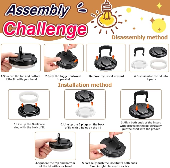 - Share your challenge: If you don't watch the video or installation manual, only a very small number of people can disassemble and install the lid by themselves,Welcome to challenge the disassembly and assembly of the lid.After successfully disassembling and assembling the lid, you will find it very interesting. If you do not know how to install the product after receiving it, please refer to the installation video and step-by-step pictures for instructions.