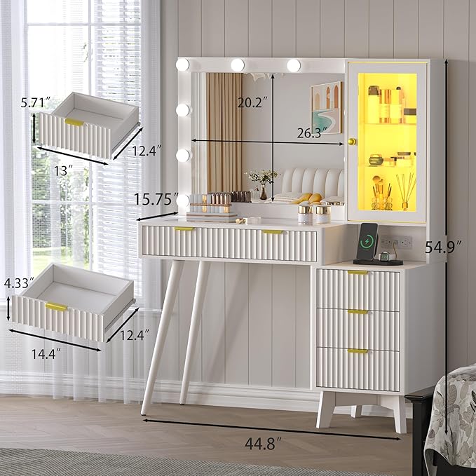 45” Fluted Makeup Vanity Desk with Mirror and Lights, Glass Top Dressing Table with 5 Drawers, LED Lighted Adjustable Cabinet, Trays & Charging Station for Bedroom Dressing Room