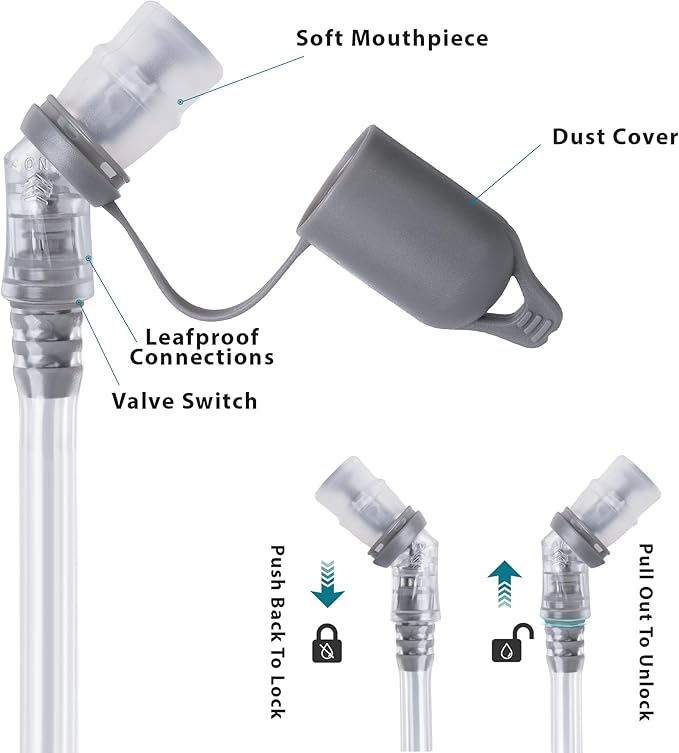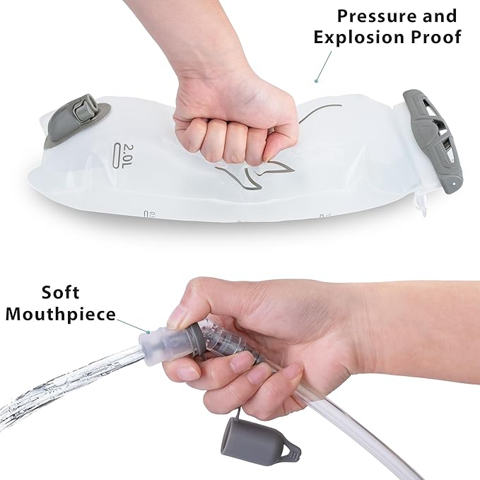 - 【High-Flow Locking Valve and Well-Sealing】The hiking bladder is equipped with our flexible, non-kinking drink tube and the high-flow. The soft and durable bite valve can provide a continuous and stable water supply, and there is also a detachable quick-release tube. The water bladder has a dust cover to keep dirt out. Meanwhile,the double-sealing technology of the water bladder enhances durability