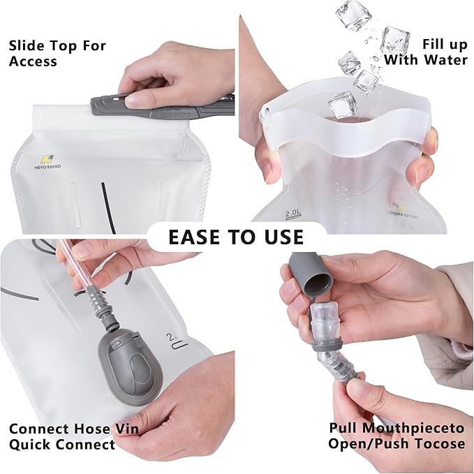 - 【Upgrade Running Hydration Bladder】N NEVO RHINO Water Bladder is specially designed for runners. The Hydration Bladder is made of high-quality food-grade materials, it won't leave a bad taste in your drink, Non-BPA. The 2L water storage bladder passed pneumatic pressure test, it is pressure-tolerant
