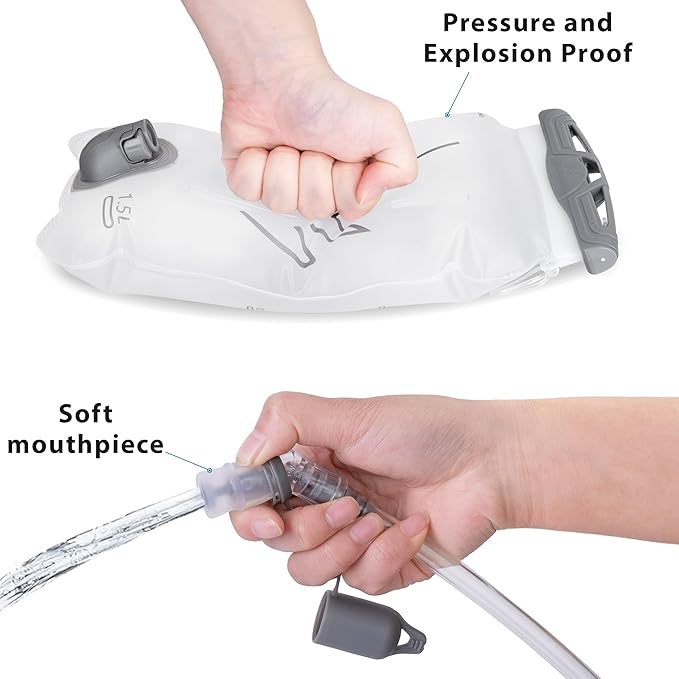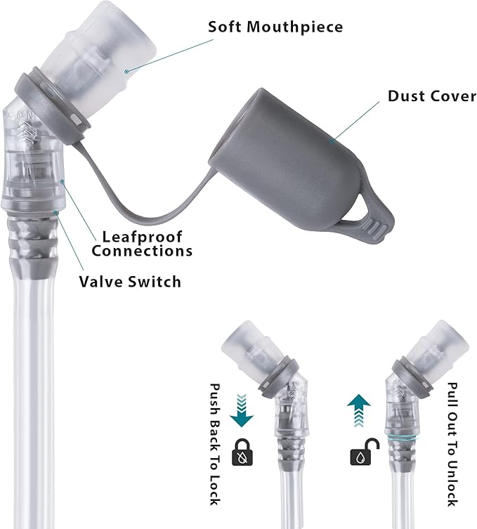 - 【High-Flow Locking Valve and Well-Sealing】The hiking bladder is equipped with our flexible, non-kinking drink tube and the high-flow. The soft and durable bite valve can provide a continuous and stable water supply, and there is also a detachable quick-release tube.The water bladder running has a dust cover to keep dirt out. Meanwhile, the double-sealing technology of the bladder bag enhances durability