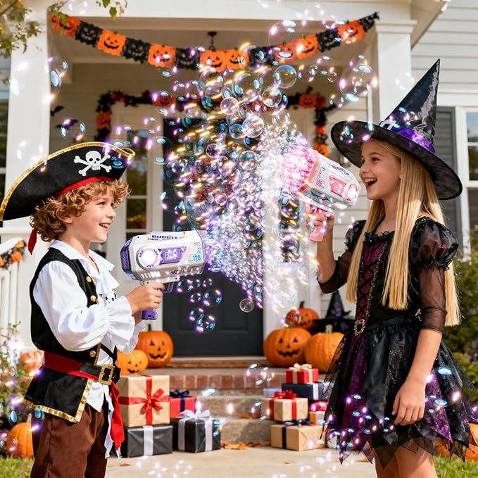 - HIGH OUTPUT THOUSANDS COLORFUL BUBBLES-BOMOCO 125-Hole Bubble Gun can generate more than thousands bubbles per minute with colorful lights to bring you amazing effects, whatever day or night, you can see rich colorful bubbles are blown out when pressing the trigger, the fantastic lights render colorful bubbles, and you can enjoy a colorful scene at night day. Nice indoor and outdoor bubble toys.