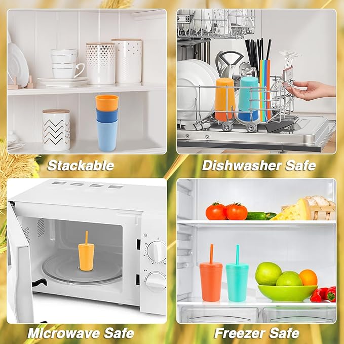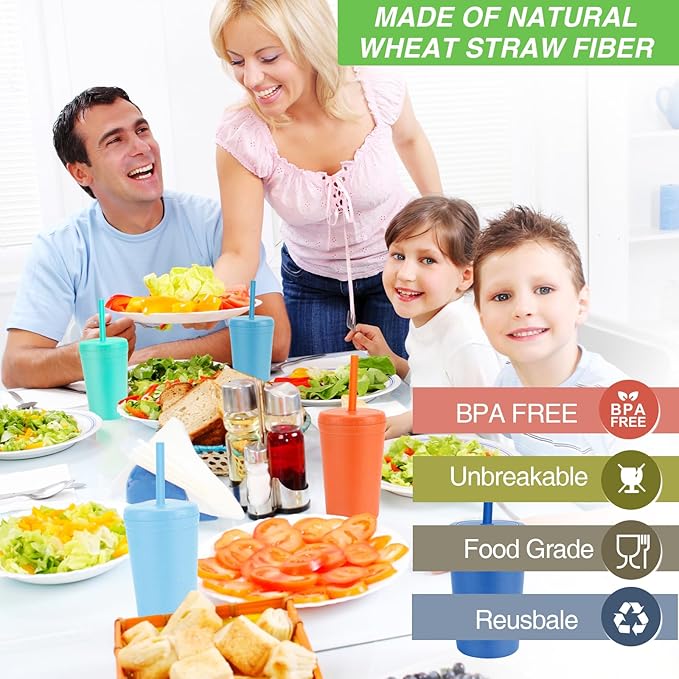 - 【Safe Material】The drinking cups set is made of natural wheat straw fiber and food grade PP, non-toxic and BPA free, the straws are made of soft silicone, chewable and safe for use and no harmful chemicals. Reusable plastic cups perfect for whole family