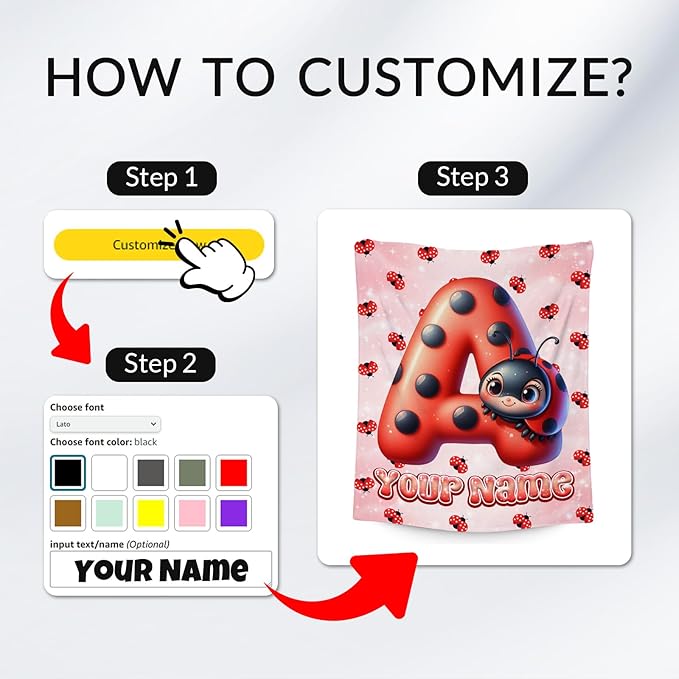 Custom Blanket with Name - Kids Blankets with Ladybug for Girls Boys - Personalized Monogram Gifts for Daughter Son - Fuzzy Plush Flannel Throws - 4 Sizes for Toddler/Children/Teens/Adults