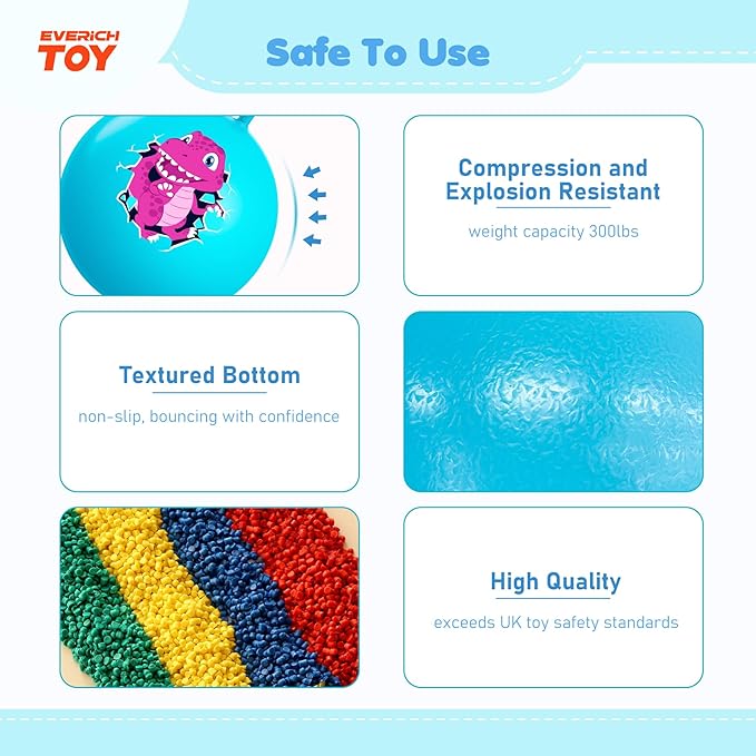 - Certified Child-Safe Construction: Made from thick, phthalate-free PVC, this jumping ball for kids meets all international safety standards. The anti-tip base make it a safe ride-on hopper ball for kids. Great for backyard play or kindergarten gym activities