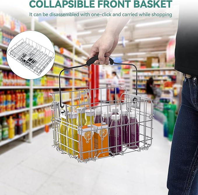 - Convenient Baskets: The front basket is foldable and detachable which can be carried for shopping with just one click of disassembly; The rear basket has a strong structure and large capacity of 55 pounds, making it great for holding groceries or even your pets