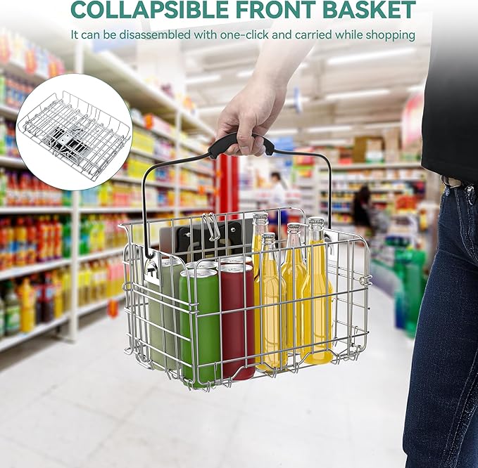 - Convenient Baskets: The front basket is foldable and detachable which can be carried for shopping with just one click of disassembly; The rear basket has a strong structure and large capacity of 55 pounds, making it great for holding groceries or even your pets