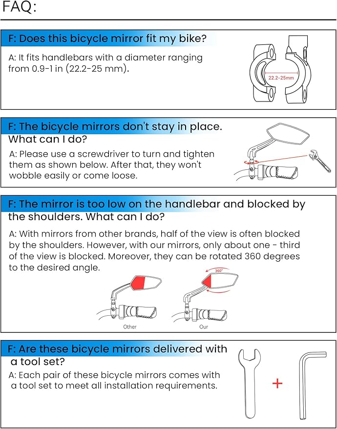 - 🚲️【Compatibility Range】 This bike mirrors for handlebars is highly versatile and suitable for all types of bicycles, including road bikes, mountain bikes, urban commuter bikes, and folding bikes. Generally, it is compatible with handlebars with a diameter of 0.9-1 in (22.2-25 mm), ensuring wide applicability. (DOESN'T FIT DROP BAR BIKES.)