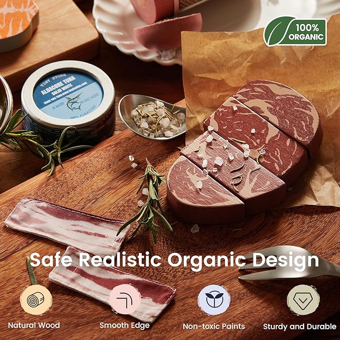 - 6 Play Food Favorites: Includes organic-inspired wooden versions of shrimp, steak, sausage, bacon, salmon, tuna Can – all thoughtfully packaged in paper trays. Encourage kids’ recognition of common protein types through hands-on play.