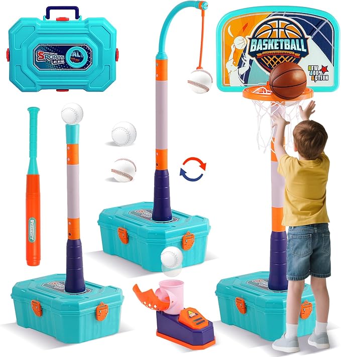 - 【Ideal Sport Toy Gift for Kids】: Kids basketball hoop and T-ball set can be used for multiple different sports. It keeps kids active, confident, and entertained for hours and improves kid's hand-eye coordination, sport skills. Ideal a reward, parties, birthday, Thanksgiving, Christmas gifts for boys and girls over 3-8