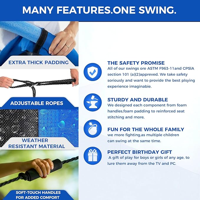 - Effortless Assembly For Family Fun: With the included hanging kit and adjustable ropes, you can set up this outdoor swing for kids in minutes on a swing set, tree, pergola, or playground, enhancing your family's outdoor experiences