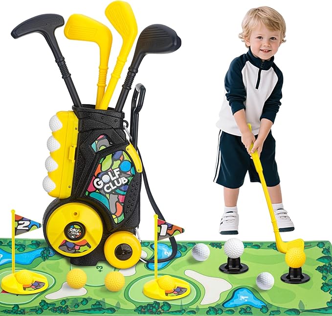 Toddler Golf Set with Cart, 4 Upgraded Handle Clubs, 47.2" Putting Mat, 8 Balls, Training Accessories for 3 4 5+ Years Old Boys Girls