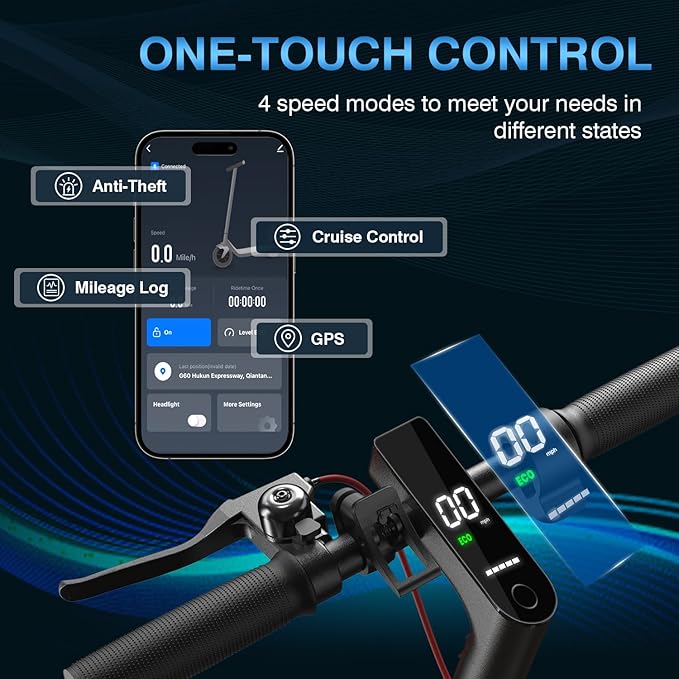 - [Smart Control, Effortless Commuting]: Command your ride with intuitive one-touch buttons + app dual control. Seamlessly switch between 4 speed modes (Walk/Eco/Drive/Sport) and activate cruise control via app. Perfect for multitasking commuters