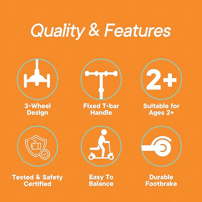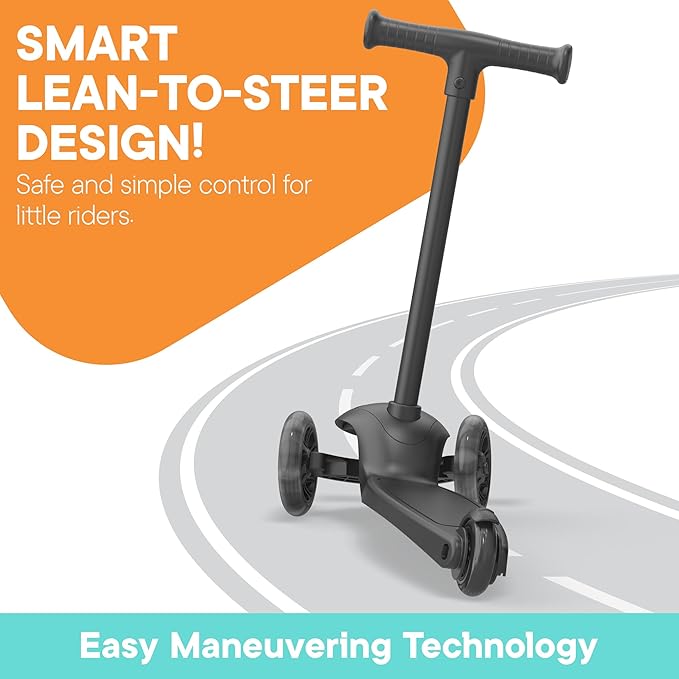 - Lean-to-Steer – With a lean-to-steer system and a fixed T-bar handle, this scooter helps toddlers stay balanced while riding. By leaning the handlebar to turn instead of twisting, kids enjoy smooth control, safer steering, and a more confident experience.