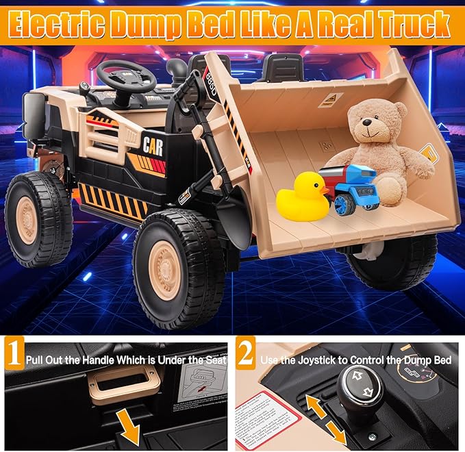 - [2-Seater Kids Ride on Truck] 12V 10AH 2-Seats kids ride on toy car has two spacious seats. The seat has a width of 19.7 inches which is suitable for 1 big kid or 2 small kids. Kids can play with their friends. Ride on toy electric dump car is made from PP material which is good to children's health. It is also designed with soft-start technology which is a best ride on toy car for kids as a Birthday, Halloween, Christmas and New Year surprise