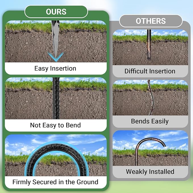- Versatile Outdoor Use: These ground stakes are ideal for various outdoor activities, including gardening, camping, and yard work. Whether used as heavy-duty trampoline stakes, swing ground stakes, soccer goal stakes, chain-link fence stakes, or for securing camping tents, they provide reliable support.
