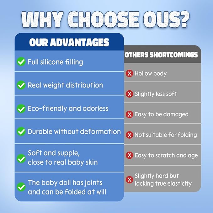 - 👶Full Silicone Baby Dolls: Compare to other reborn baby dolls, our all silicone baby dolls are meticulously handcrafted using high-quality silicone materials , with a soft and realistic texture, resembling a ' real ' baby.
