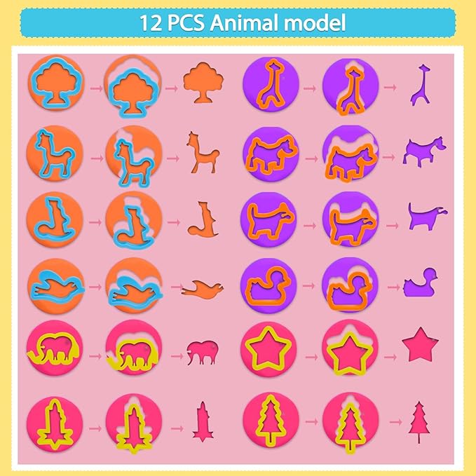 - 24Pcs Value Pack: Includes 12 basic dough tools, 12 animal molds,including plastic scissors and knives for children's safety, plastic rollers, etc. Bright and colorful, used for shaping, molding, and crafting with playdough, clay, plasticine and sand perfect for fostering creativity.Note: Only tools, not clay