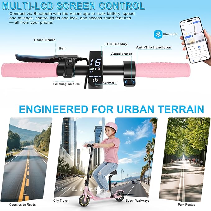 - Stylish Pink Scooter for Girls & Women – This pink electric scooter with seat and phone holder is a stylish and practical choice for girls, teens, or women. Perfect for commuting, college campuses, or weekend rides, this folding electric scooter combines beauty with daily convenience
