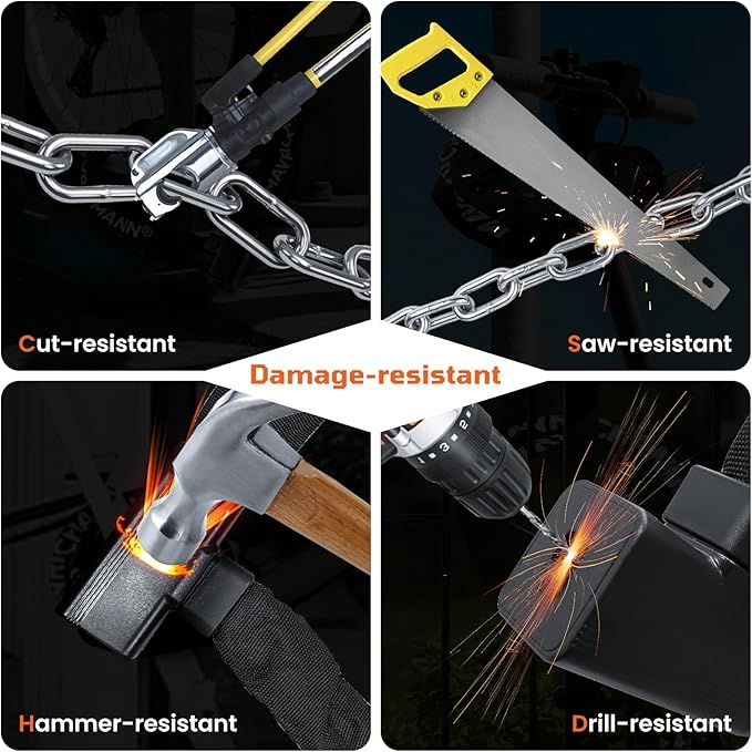 - 【Widely Use】 The overall length of the bike locks heavy duty anti theft is about 3.3 feet. The links are about 2.56 inches long and about 0.32 inches inch thick. Lock Weight: 2.65 pounds. Ideal for bicycles, ebikes, scooters, motorcycles, ladders, lawnmowers, gates, fences, bbq, sport equipment and many others against theft.