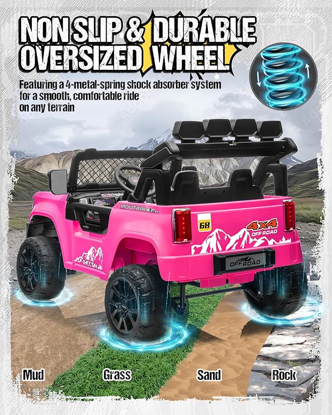 - [Safe Driving] The Battery powered truck is equipped with soft start, double doors, fast and slow speed adjustment. Each seat is equipped with its own independent 2-point safety harness, ensuring that both drivers are securely fastened and protected during every ride. Full metal suspension provides better shock absorption, which can reduce the bumps on the rugged road, giving your kids the safest driving experience.