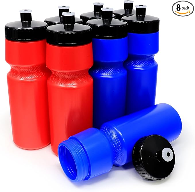 Rolling Sands USA Made Reusable 24 oz Sports Water Bottles, 8 Pack, BPA-Free, Easy Open Pull-Top, Fits Most Bike Cages, Dishwasher Safe, Lightweight - for Kids to Adults, Red and Blue