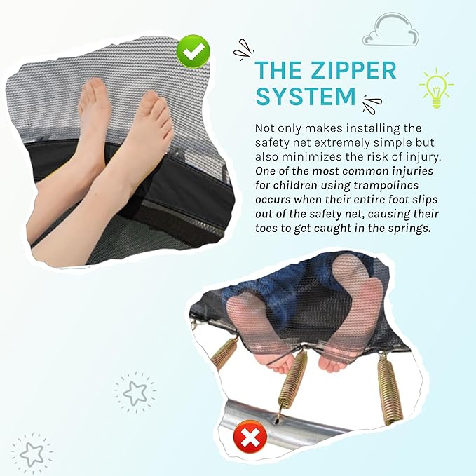- [ Smart Zipper System, NO-GAP! ]: The innovative zipper system design of our 10ft kids trampoline makes net installation extremely easy, while also ensuring a seamless connection between the mat and the net.