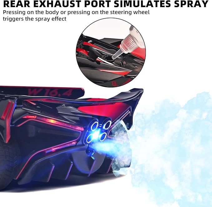 - 【Multifunctional Toddler Toy Cars】The doors, front hood and rear hood of diecast toy cars can be opened. After filling water into the water filler under the rear hood, press the front wheel to trigger the spray function and sound and light effects.The tail spray effect is as cool as a rocket booster.The race car toy rear wheels have a pull back function.The front wheels can turn left and right, press the horn to trigger sound and light effects,shock absorbers on all four wheels.