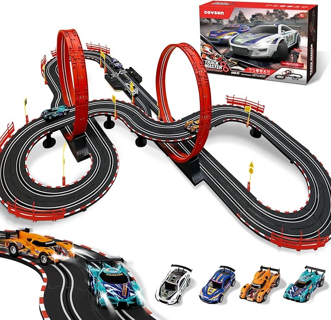 - 【Ultimate Racing Fun for Kids】This 30FT electric slot car race track brings hours of excitement for kids aged 6-12. With 4 slot cars, children can enjoy dual racing action, testing their speed and reflexes. The included lap counter keeps the competition thrilling, and the circular overpass track design adds dynamic twists and turns, making every race a new challenge for young racers