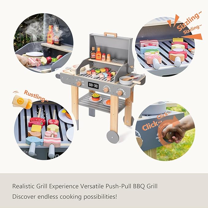 - Complete Wooden Grill Playset: Includes grilled pizza, hamburgers, skewers, fish, and more. Kids can pretend to cook with realistic details like oil, barbecue sauce, and seasoning, creating a fun, immersive experience