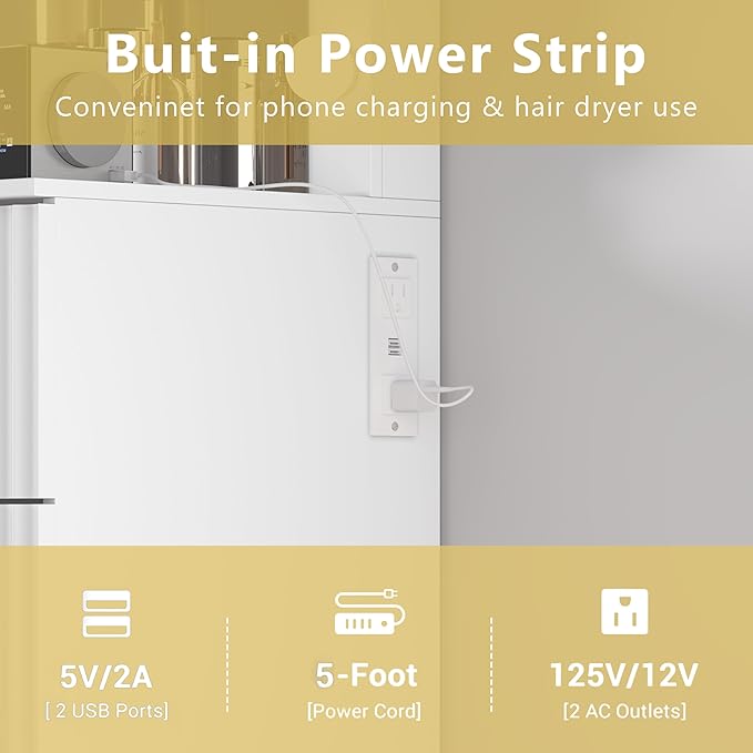 - Built-In Charging Station: Includes two standard power outlets and two USB ports, making it easy to charge your phone, tablet, hair dryer, or curling iron while getting ready. BORNOON makeup vanity desk with lighted mirror keeps all your beauty tools and devices fully powered, streamlining your daily routine and minimizing clutter. A practical upgrade for modern dressing needs.