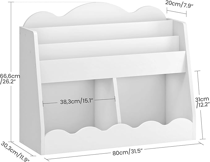 - Generous Storage: At 31.5"L x 11.9"W x 26.2"H, this kids bookshelf includes 3 book slots and 2 deep toy bins, helping keep bedrooms or playrooms organized. It accommodates everything from picture books to building blocks, practical for growing collections