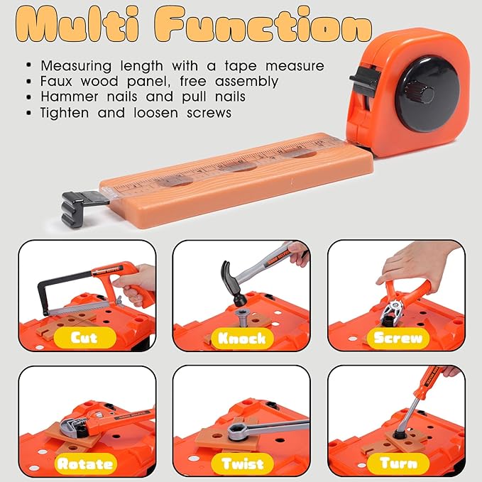 - 2 in 1 multifunctional toy box-As a Toolbox, it can stores all tools neatly and features 4 wheels with a fun car-like design, adding extra excitement for kids. As a Workbench, it transforms into a fully equipped play station with various interactive functions-like hammer nails, tighten and loosen screws! Simulate sawing wood planks, measuring length with a tape measure, and more for creative building and role-play