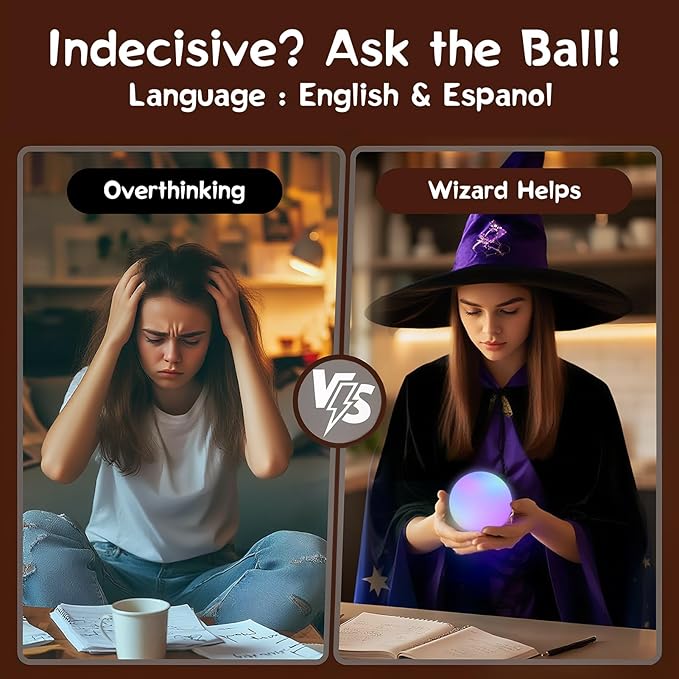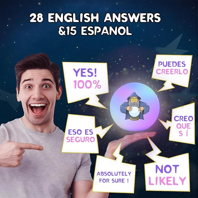 - ►[Fortune Teller Ball]:Rechargeable,Silly toys speaker,Ask a YES/NO question and Touch orb's top or Beat table nearby to awaken wizard.It brings much fun for family! 28 English & 16 Espanol Answers.