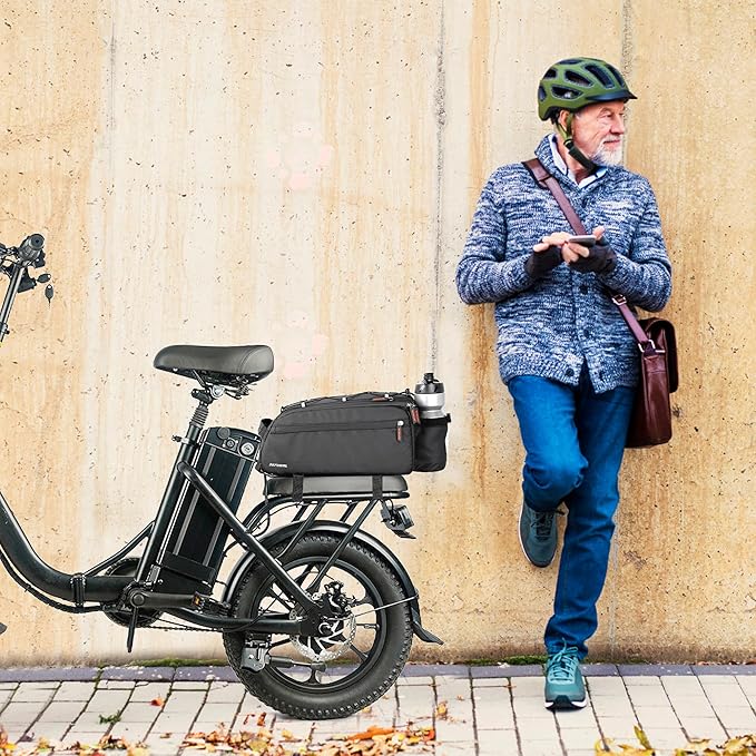 - 🚴STABLE CONSTRUCTION & WATERPROOF: Built-in rigid support panels on both sides and base hold this bike rack bag's shape, staying upright even on bumpy rides, no more side flop & sags. Made of PU-coated polyester, it’s water resistant, durable and wipes clean easily. Rain cover included for worry-free rides on rainy days.