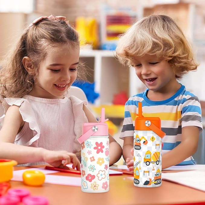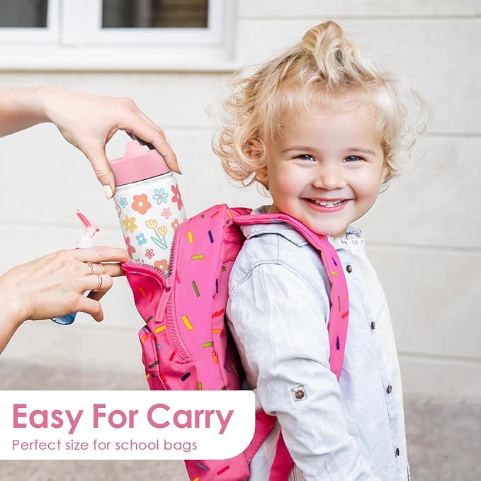 Kids Water Bottle Stainless Steel with Straw Lid, Floral Water Bottle 12oz, Travel Tumbler, Gifts for Girls, Birthday, Christmas, Back To School
