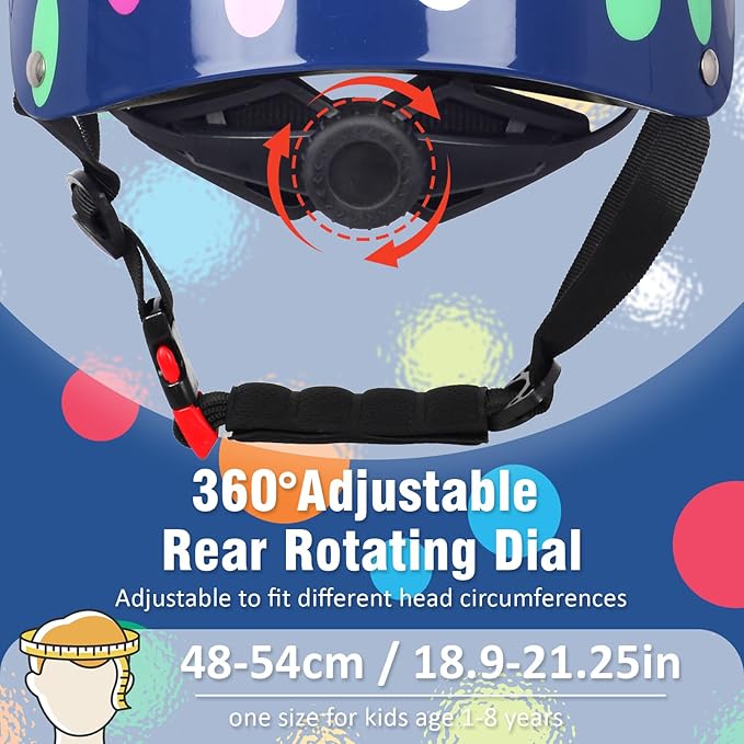 - The kids helmet includes an adjustment knob at the back, allowing you to customize the head circumference to fit toddlers kids. The adjustable chin strap also ensures a secure and comfortable fit.