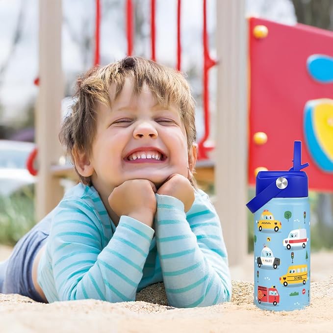 Transportation Kids Water Bottle With Straw Lid 12oz Insulated Stainless Steel, Travel Tumbler, Gifts For Boys, Birthday, Christmas, Back To School