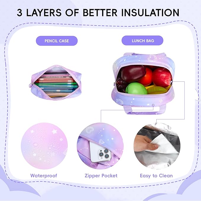 Tanou Backpack with Lunch Box for Girls, Kawaii Set School Bag for Kid Elementary Middle School, Aesthetic Laptop Bookbag Lightweight, Purple