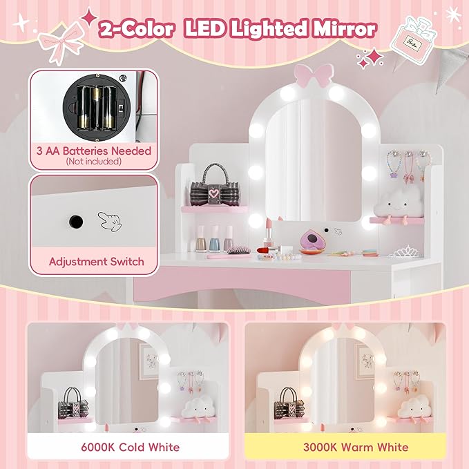- 【2-Color LED Lighted Mirror】: Make dress-up time magical with a vanity mirror featuring two lighting modes—cool white (6000K) and warm yellow (3000K). It creates a realistic makeup setting, perfect for pretend play and boosting confidence. Requires 3 AA batteries (not included).
