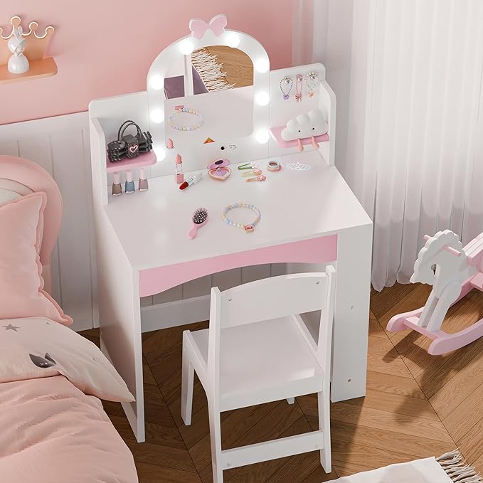 - 【Safe & Built to Last】: Crafted from durable MDF and tested to meet ASTM F963-17 and CPSIA standards, this kids vanity desk features rounded edges and a smooth, splinter-free surface for safe everyday use. It’s designed for both safety and long-lasting play.