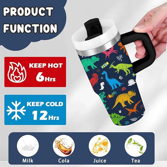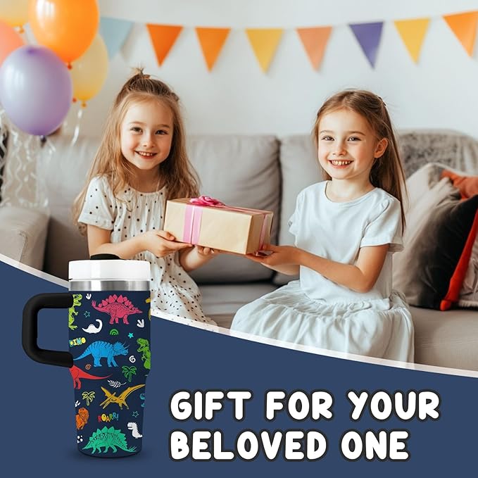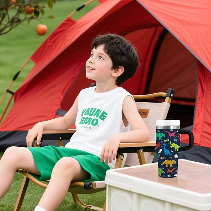 - 🦕 Dino-Mite Design for Kids - This 14oz tumbler features vivid dinosaur prints with realistic T-Rex, Triceratops and Stegosaurus designs, perfect for little paleontologists. The colorful Jurassic patterns make hydration a prehistoric adventure