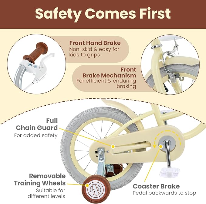 - 【Dual Brake System & 4-step Installation:】The kids' bicycle is designed with both a hand brake and a coaster brake, ensuring quick and safe stops. Additionally, it features a fully enclosed chain guard to keep children's hands away from the chains. This bike arrives 95% pre-assembled, with no brake installation required. Simply follow these four installation steps: First, attach the handlebar. Second, secure the basket. Third, affix the pedals. Fourth, attach the removable training wheels.