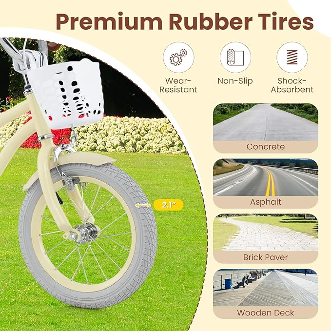 - 【Design for Children】 Featuring an adorable aesthetic and trendy color combination, this bike makes for an ideal birthday or holiday gift for your children. It includes practical elements like a convenient bell, a detachable front basket for storage, a cozy seat, and non-slip pedals for secure grip. Furthermore, the 16” and 18” models are equipped with reflectors for improved visibility in low-light situations, while the 18” bike boasts a kickstand for effortless parking.