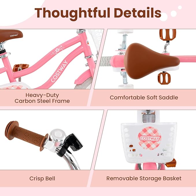COSTWAY Kids Bike, 12 14 16 18 Inch Toddler Bike Children Bicycle w/Training Wheels, Hand & Coaster Brakes, Adjustable Saddle & Handlebar, Basket, Bell, Kids Bicycle for Girls Boys Aged 3-8 Years Old